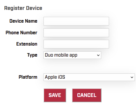 - In the following menu you'll have to add info such as a nickname for the device to help you recognize it, your phone number, and type of authentication. For "Type" select "Duo Mobile App" then for "Platform" select the the option that closely describes your mobile device.