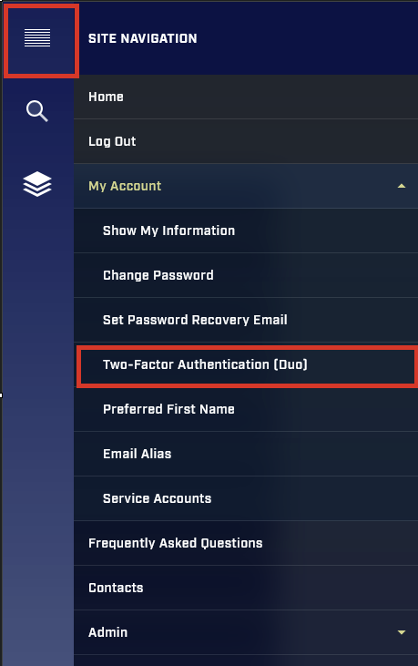 - Once signed in, you will be directed to the "Show My Information" page. Go to the sidebar on the right side of the page and click on the "lines" icon. This will pop out the sidebar, click on the "Two-Factor Authentication (Duo)" button.