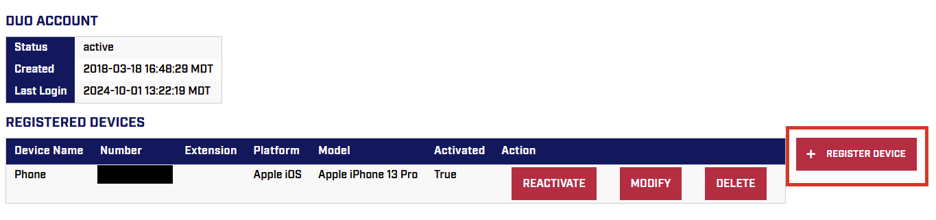 - The following page will show if you have any registered devices with DUO, feel free to modify/delete devices if they are no longer relevant. For this guide we'll add a device, so click on the "Register Device" button off to the side.
