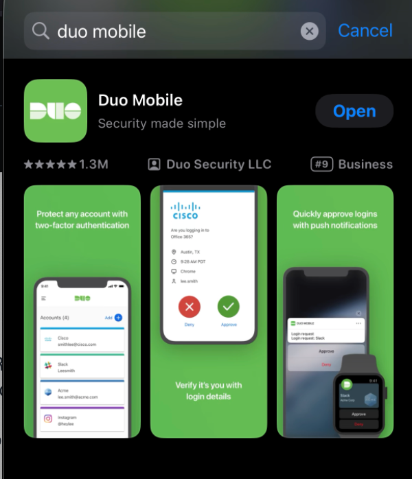 - On your phone, or any other Wi-Fi enabled mobile device, open your App Store and search for the "DUO Mobile" app. The app you're looking for is shown below.